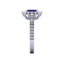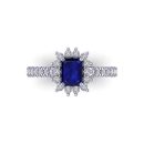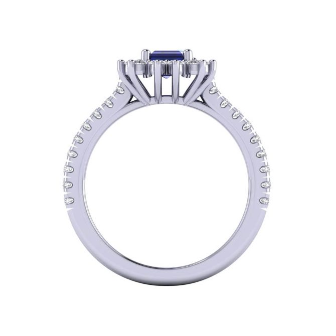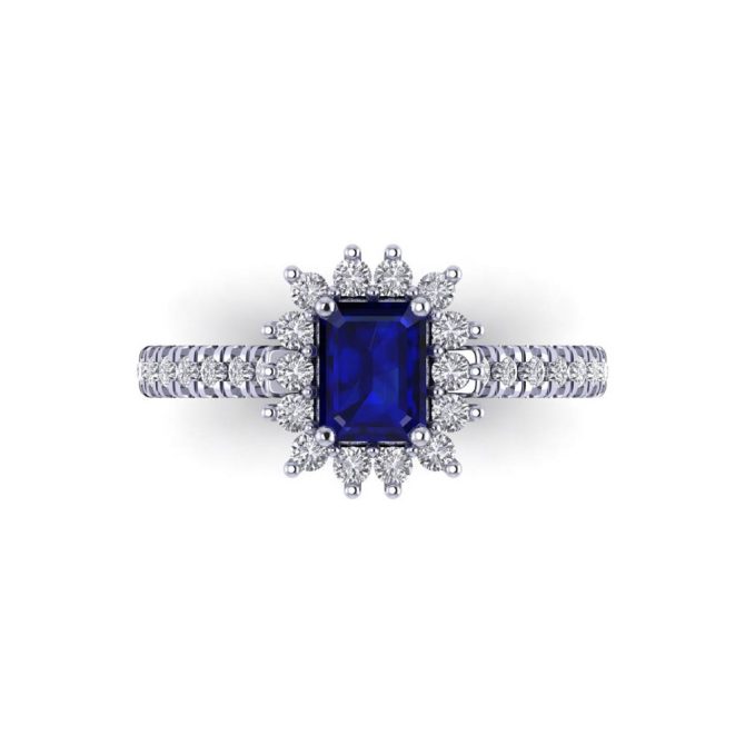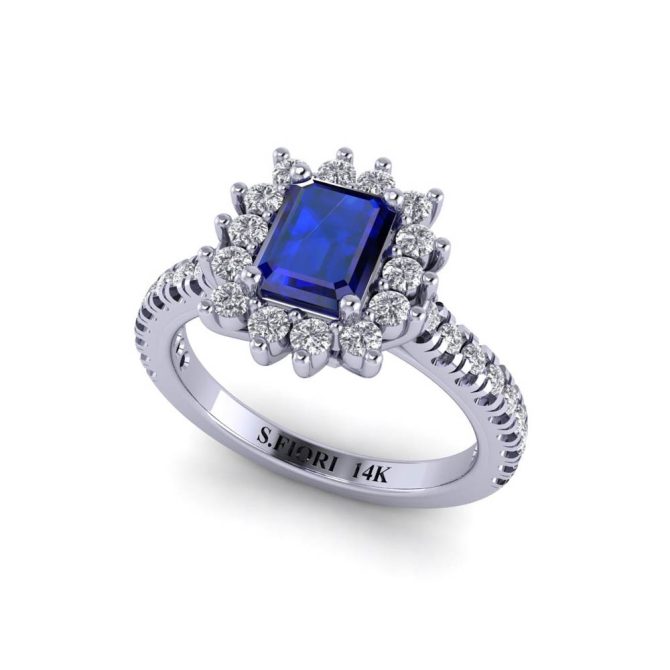 14K Gold Translucent Blue Sapphire Ring Featuring 0.87 Cts Emerald cut Shaped Blue Sapphire Surrounded by 0.57 Cts Round Cut White Diamond