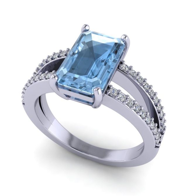14K Gold Peaceful Aquamarine Rings Featuring 2.38ct Emerald cut Shaped Aquamarine surrounded by 0.20 cts Round Shaped White Diamond