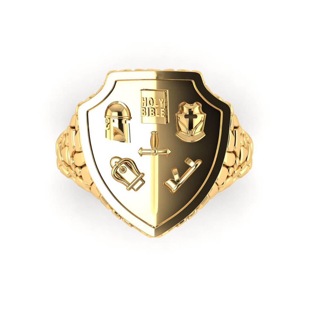 14K Gold oG Collection Armor Of God Ring Featuring Armor of God Symbols on Shield and Nuggets on Shank
