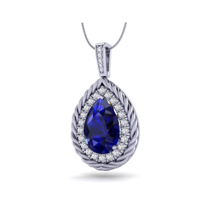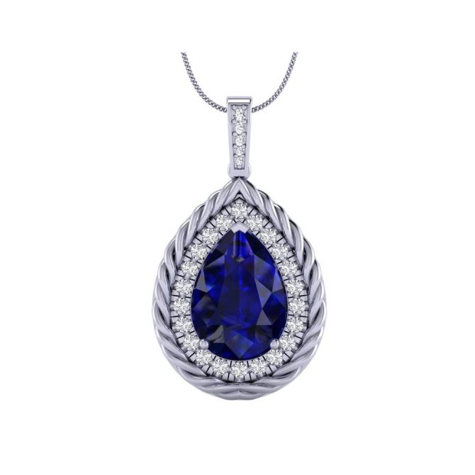 14K Gold Translucent Blue Sapphire Pendant Featuring 4.18 Cts Pear Shaped Translucent Blue Sapphire surrounded by 0.45 cts Round Shaped White Diamond