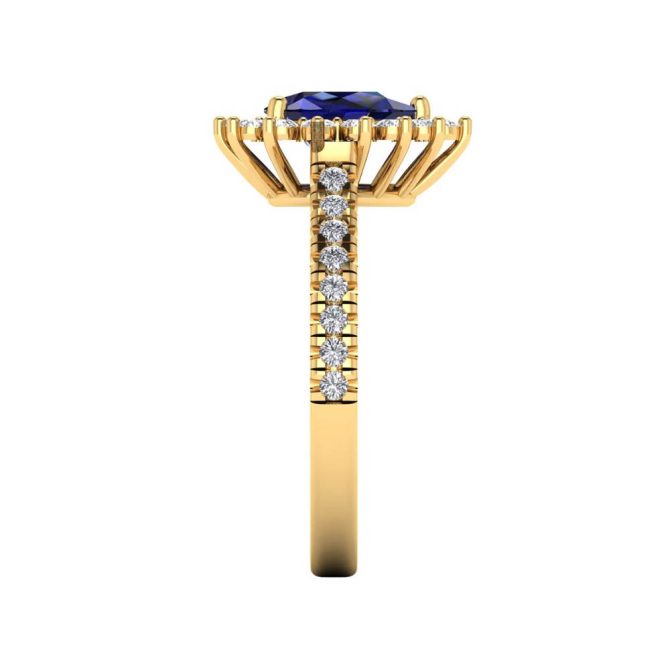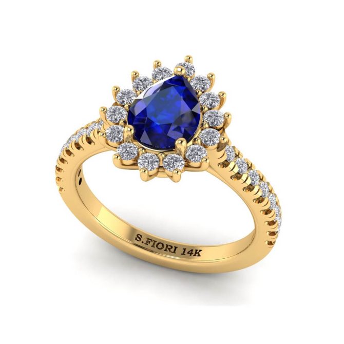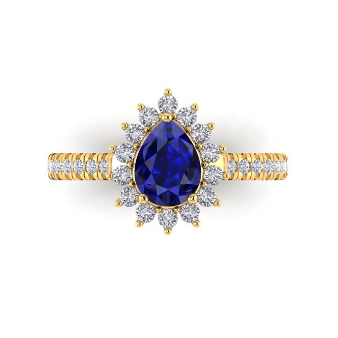 14K Gold Translucent Blue Sapphire Ring Featuring 0.89 Cts Pear Shaped Blue Sapphire Surrounded by 0.55 cts Round Shaped White Diamond