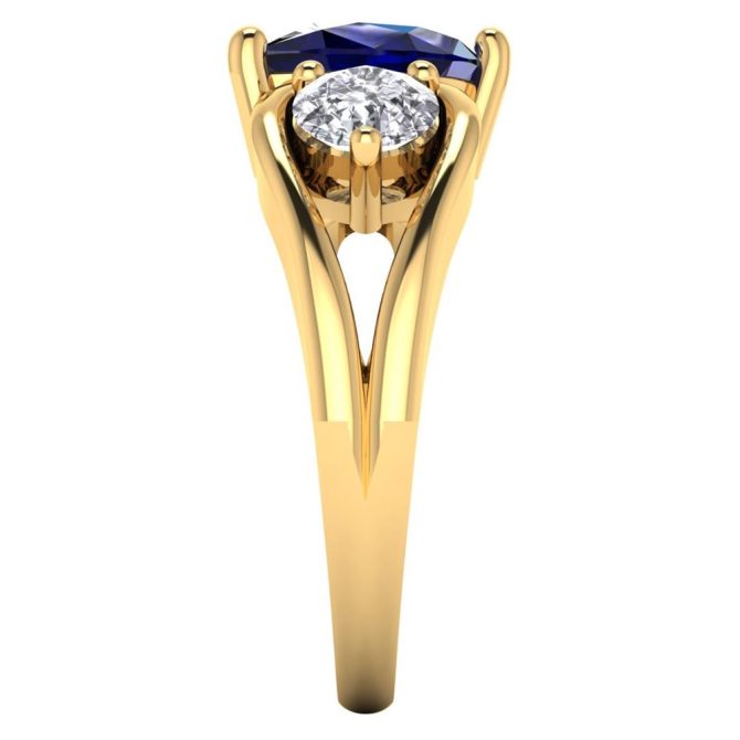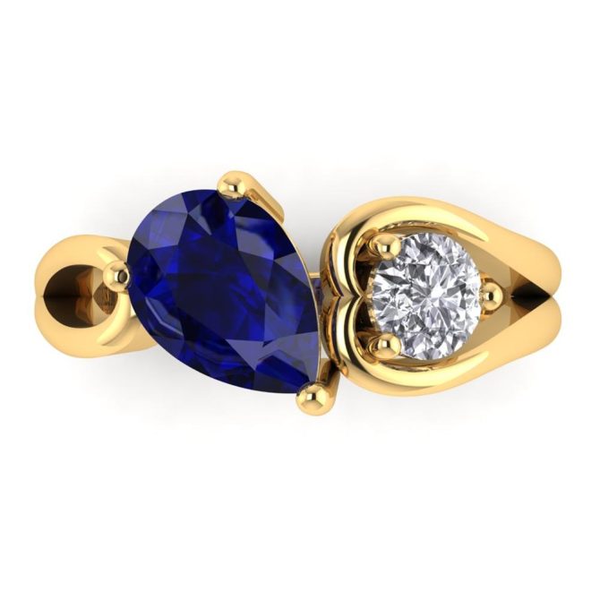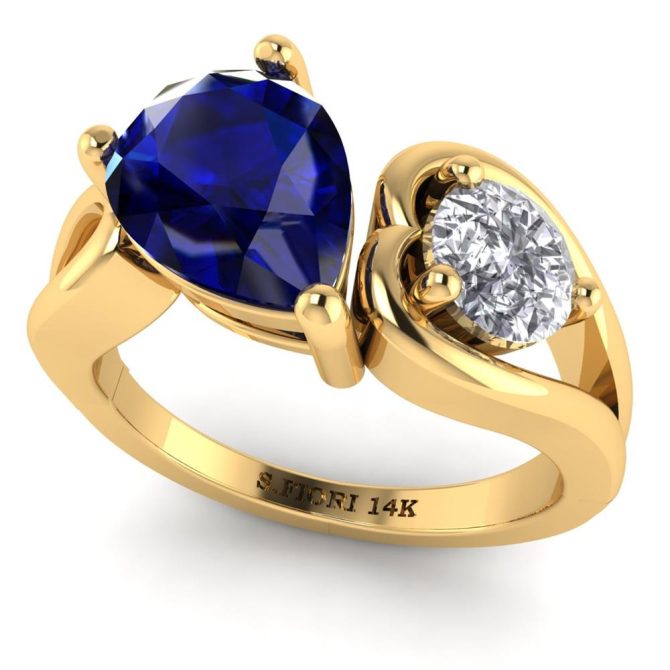 14K Gold Translucent Blue Sapphire Ring Featuring 2.00 Cts Pear Shaped Blue Sapphire Surrounded By 0.56 Cts Round Brilliant Cut White Diamond