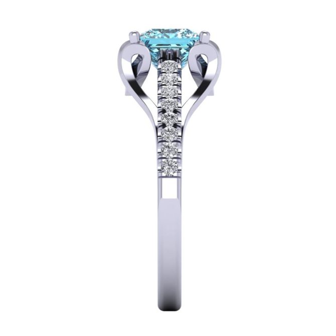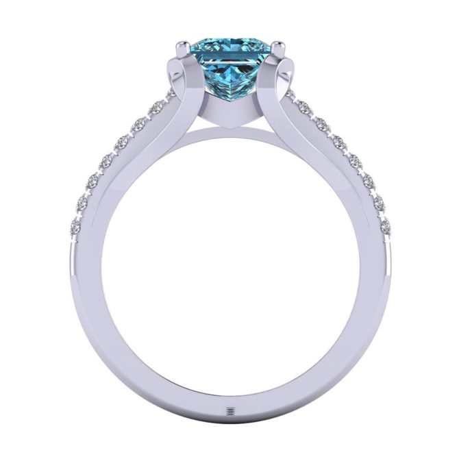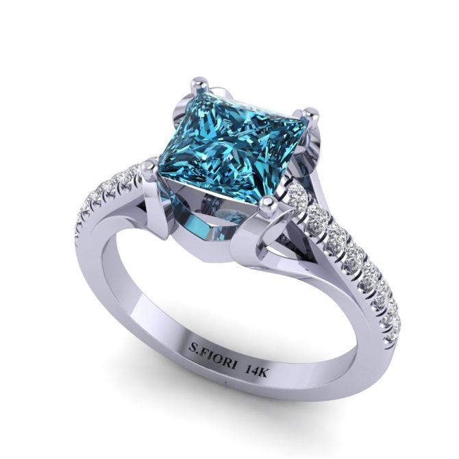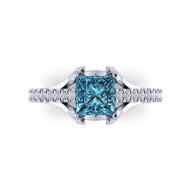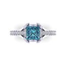 14K Gold Blue Diamond Enhanced Color Ring Featuring 1.50 Princess Shaped Blue Diamond Enhanced Color surrounded by 0.25 Round White Diamond