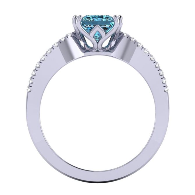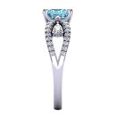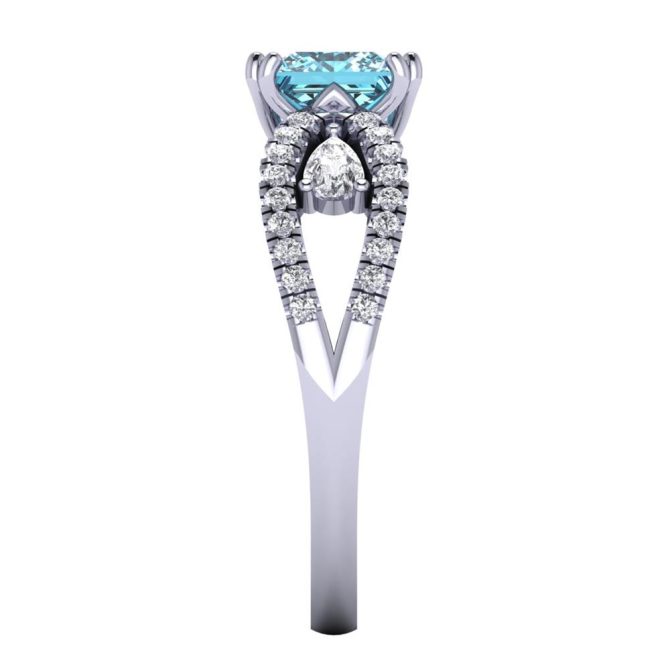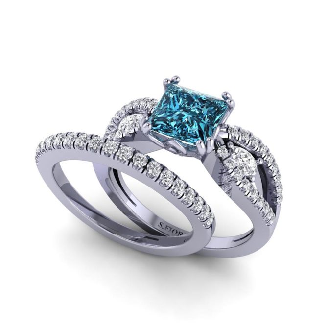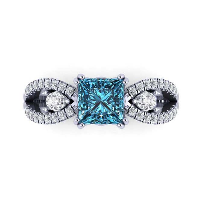 14K Gold Blue Diamond Enhanced Color Ring Featuring 1.50 Princess Shaped Blue Diamond Enhanced Color surrounded by 0.19 cts Pear Shaped White Diamond, 0.23 cts Round Shaped White Diamond