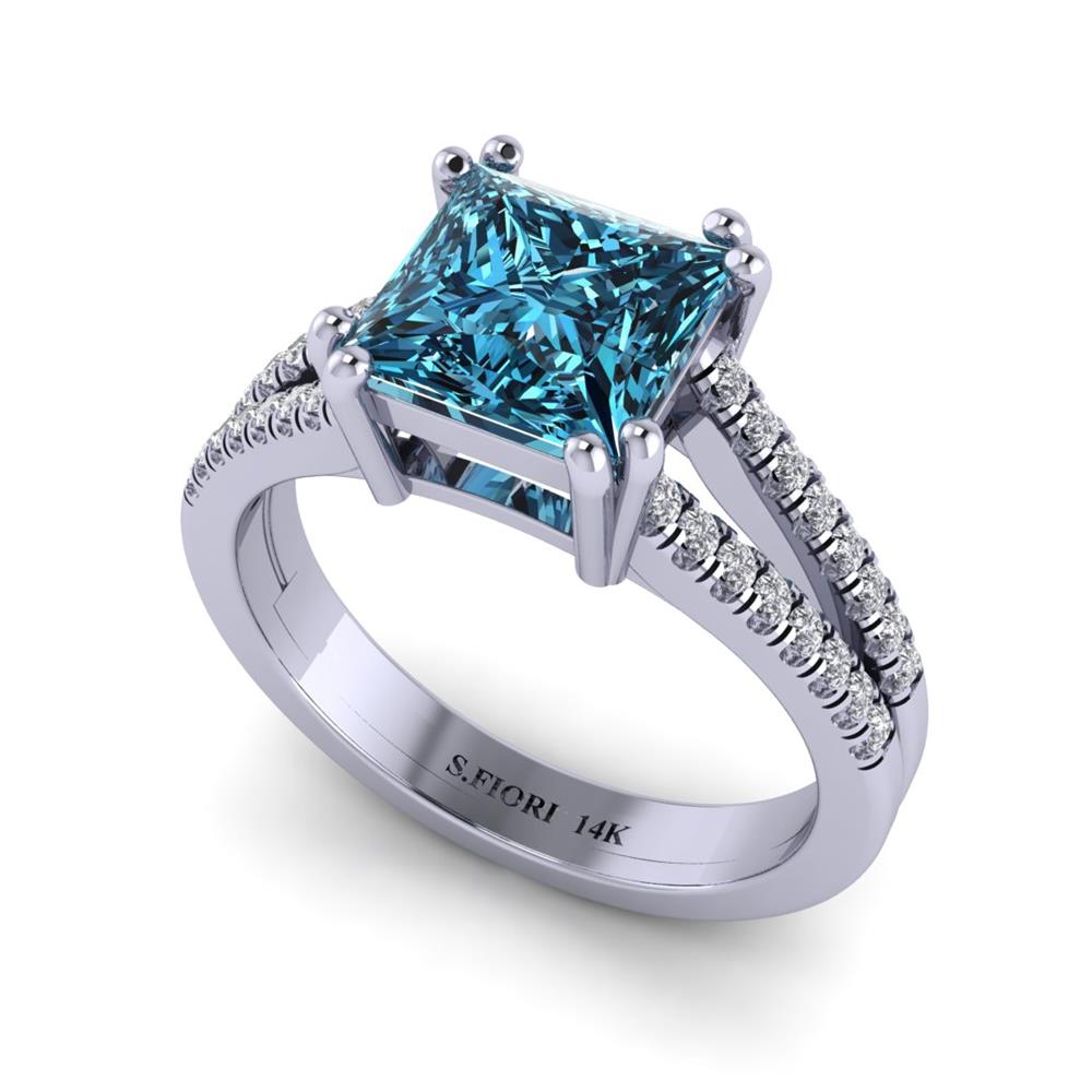 14K Gold Blue Diamond Enhanced Color Ring Featuring 2.00 Princess Shaped Blue Diamond Enhanced Color surrounded by 0.21 Round White Diamond