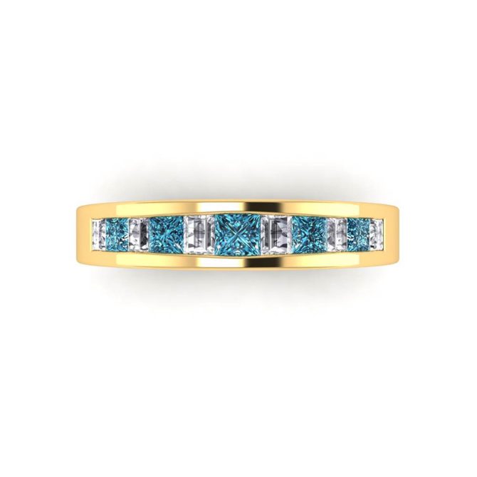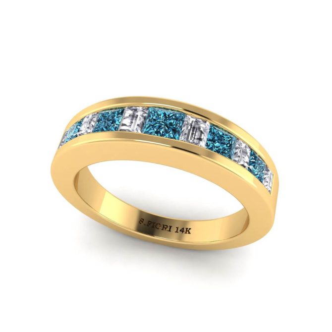 14K Gold Blue Diamond Enhanced Color Rings Featuring 0.87 cts Princess Shaped Blue Diamond, 0.51 cts Baguette Shaped White Diamond