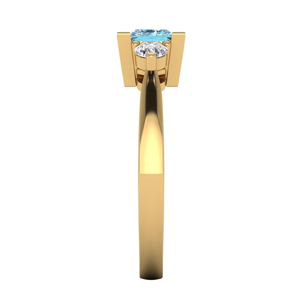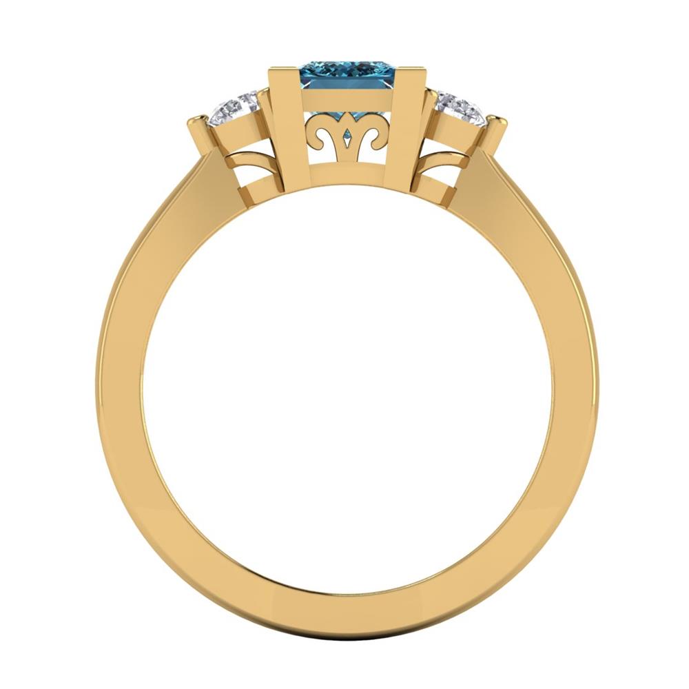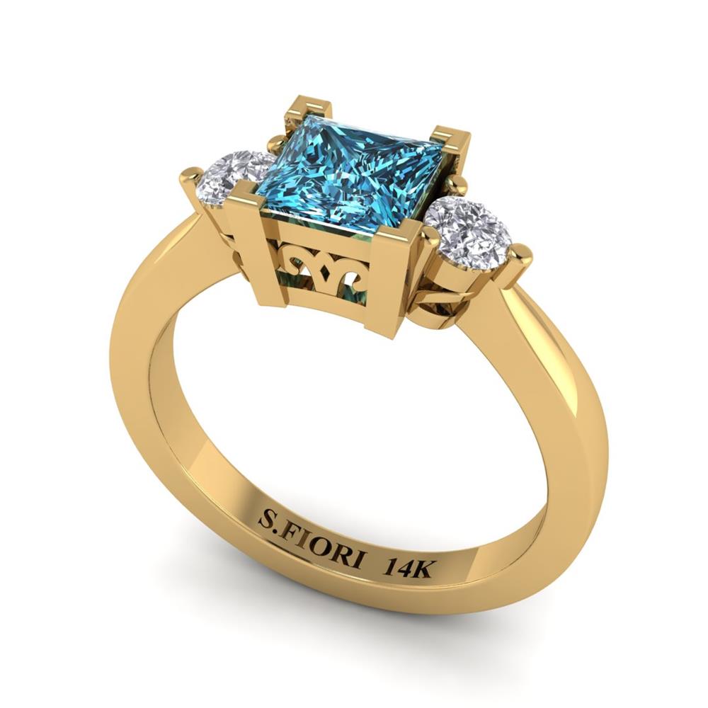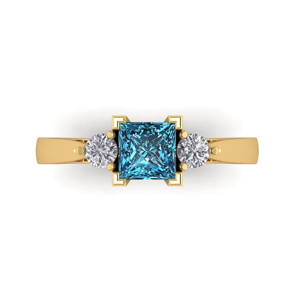 14K Gold Blue Diamond Enhanced Color Three Stone Ring Featuring 1.50 Cts Princess Shaped Blue Diamond Enhanced Color Surrounded by 0.28 Cts Round Brilliant Cut White Diamond