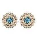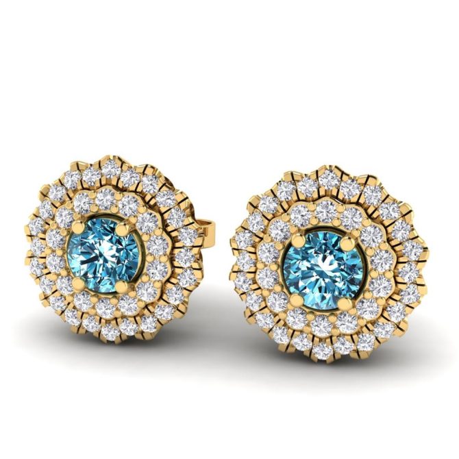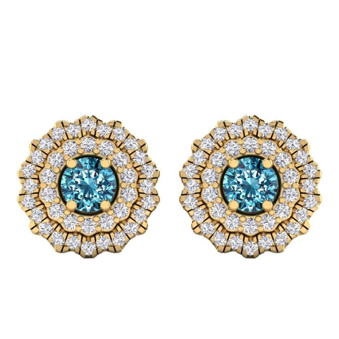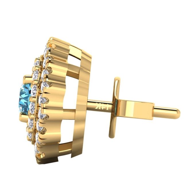 14K Gold Blue Diamond Enhanced Color Earrings Featuring 0.50 cts Round Brilliant Cut Blue Diamond Enhanced Color Surrounded by 0.22 cts Round Cut White Diamond