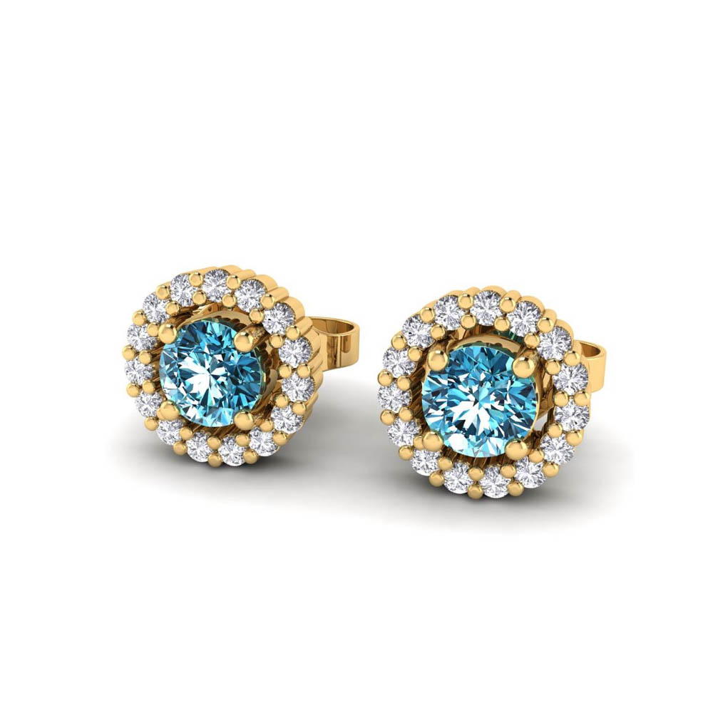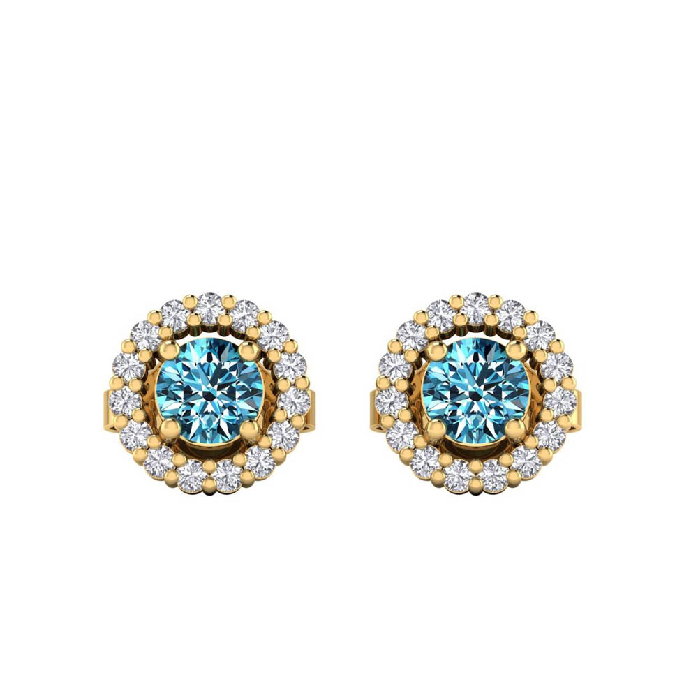 14K Gold Blue Diamond Enhanced Color Earrings Featuring 0.50 ct Round Shaped Blue Diamond Enhanced Color surrounded by 0.20 ct Round White Diamond