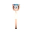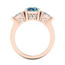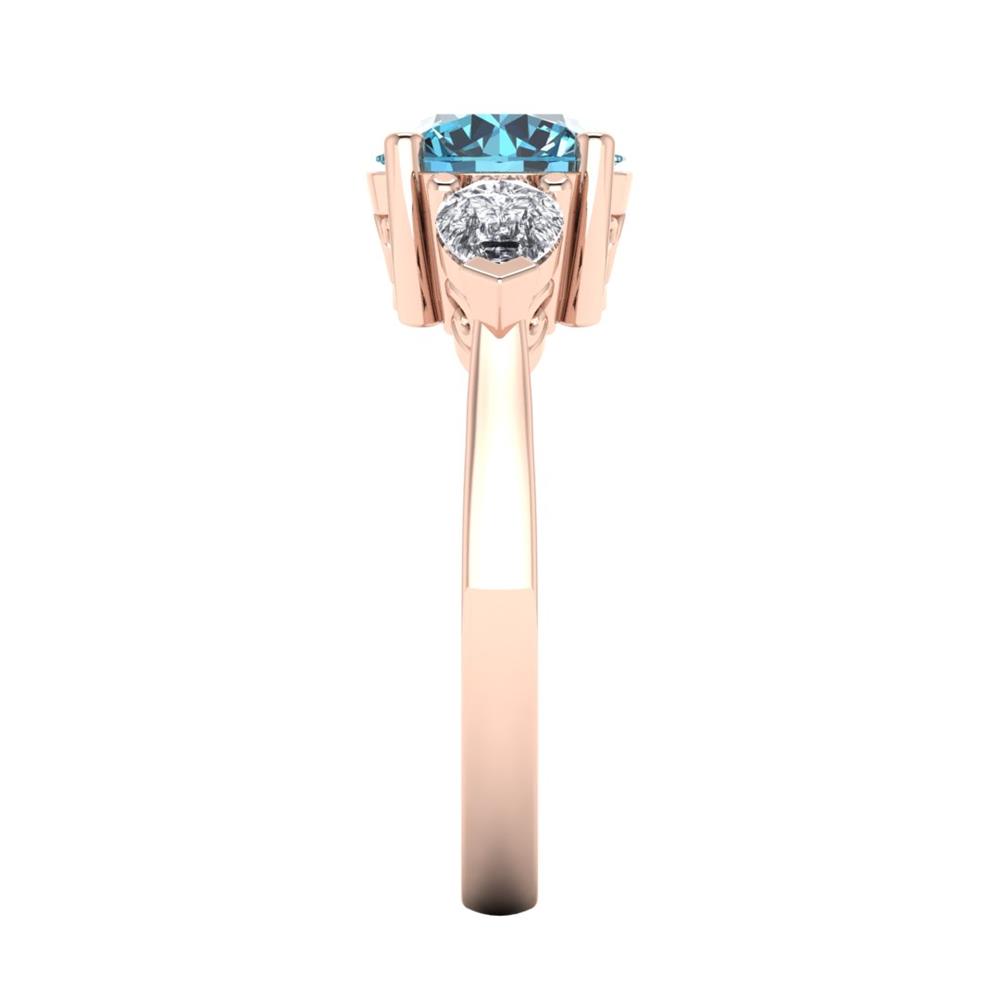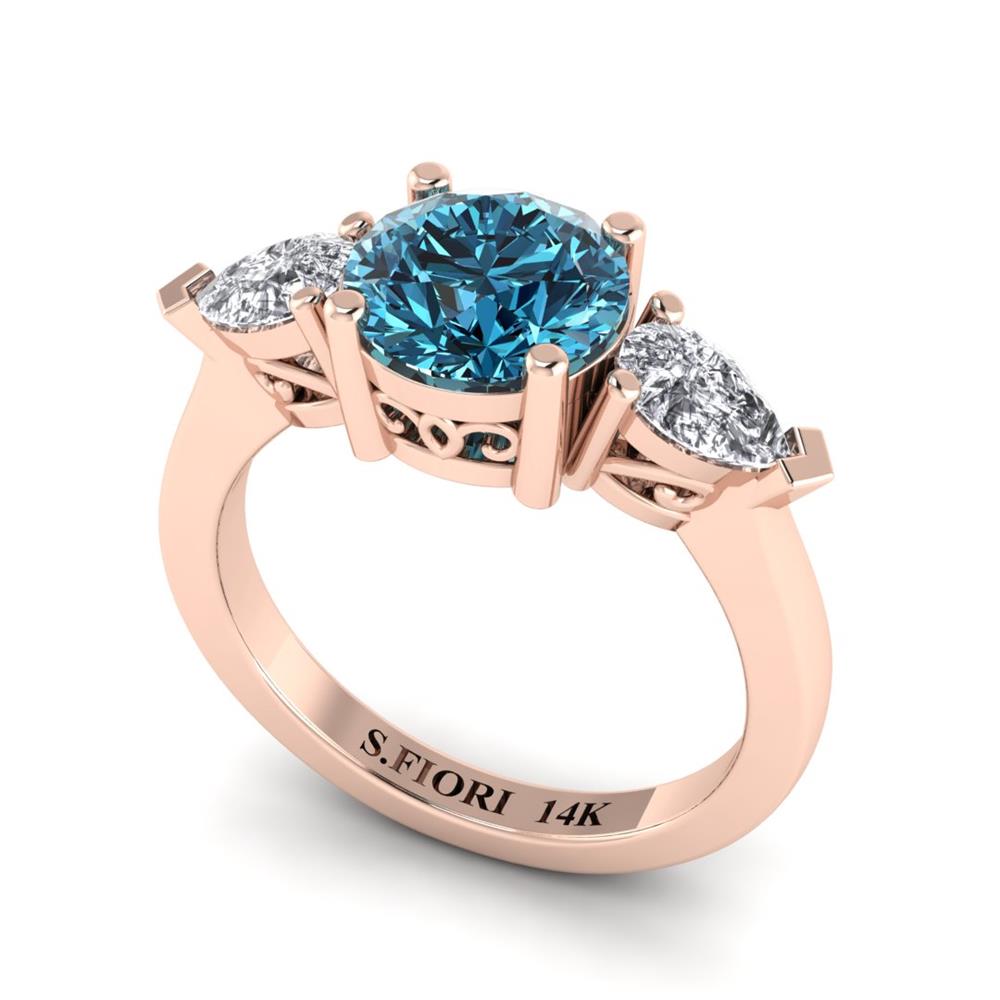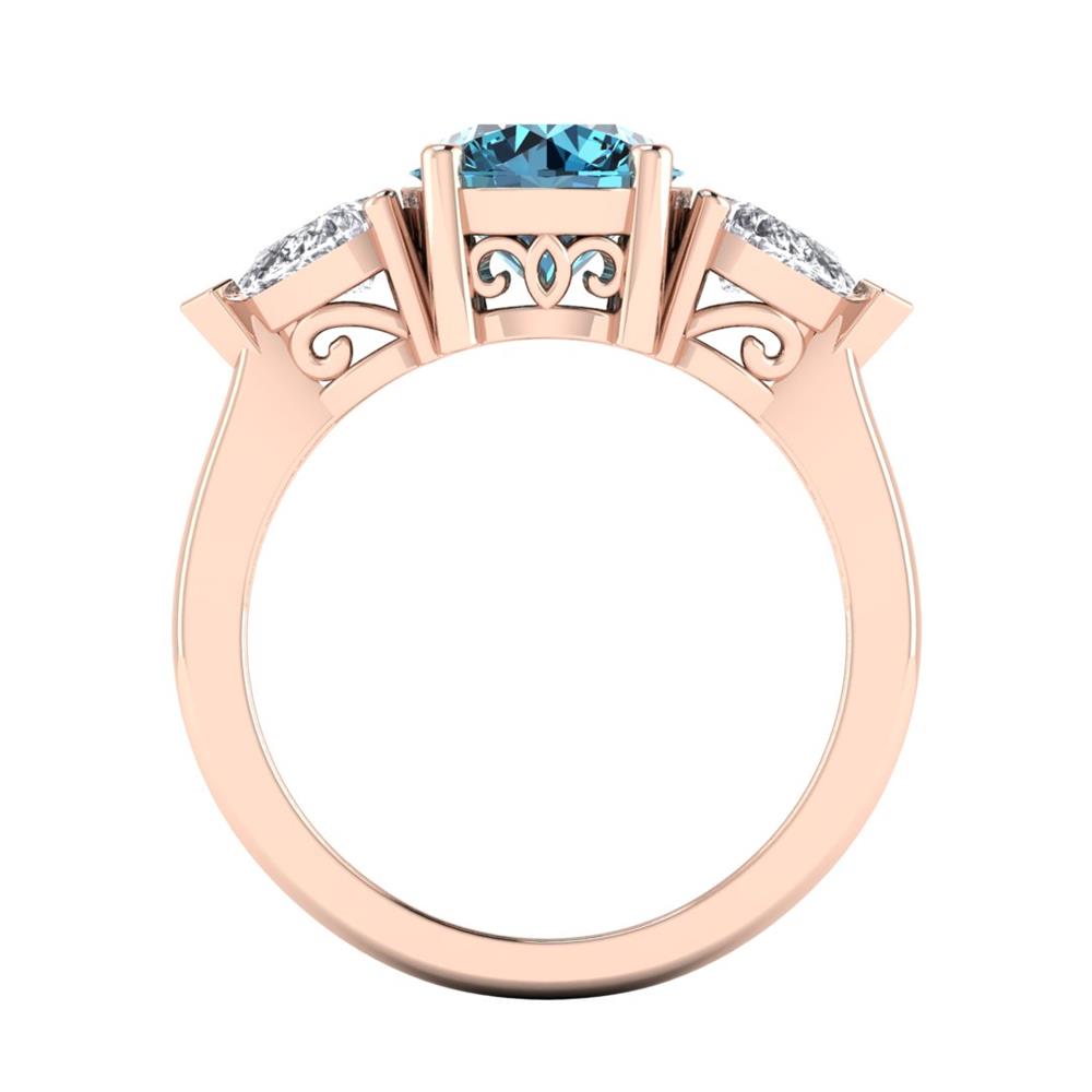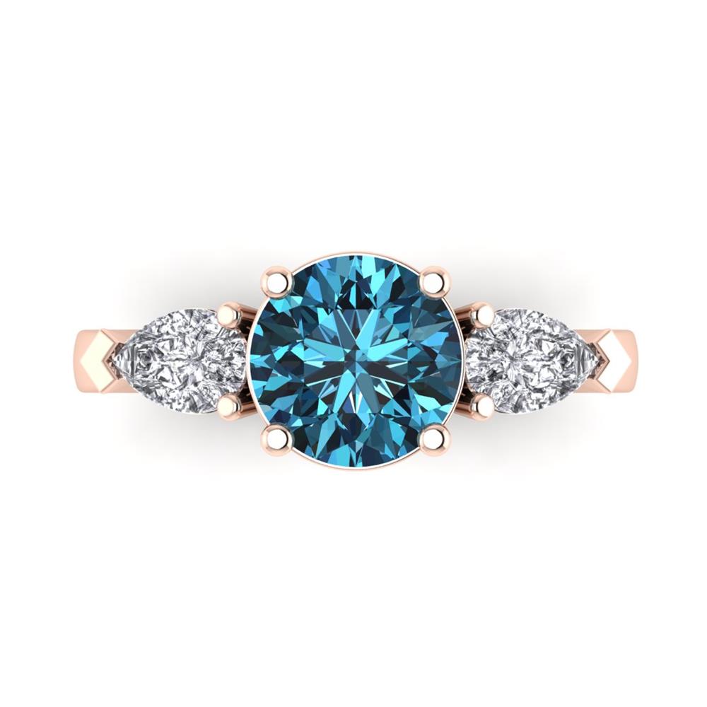 14K Gold Blue Diamond Enhanced Color Three Stone Ring Featuring 2.05 Cts Round Brilliant Cut Blue Diamond Enhanced Color Surrounded by 1.00 Cts Pear Cut White Diamond