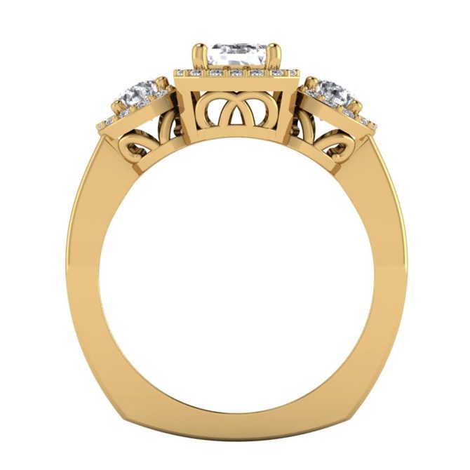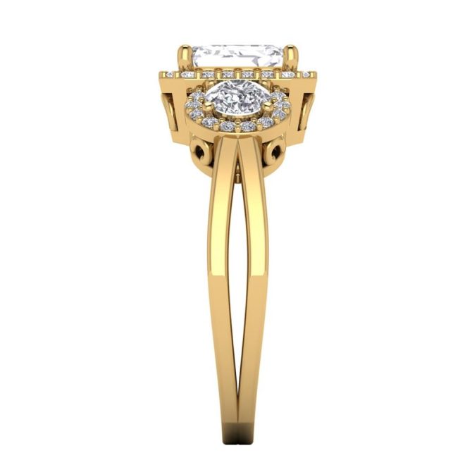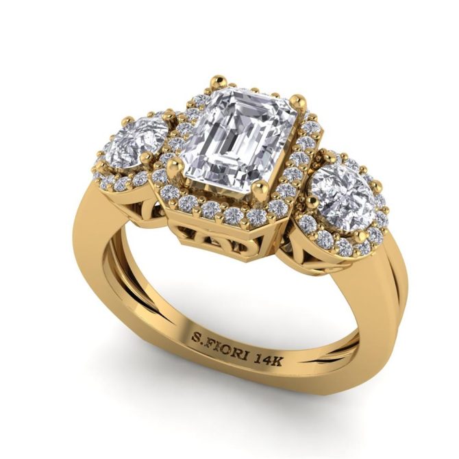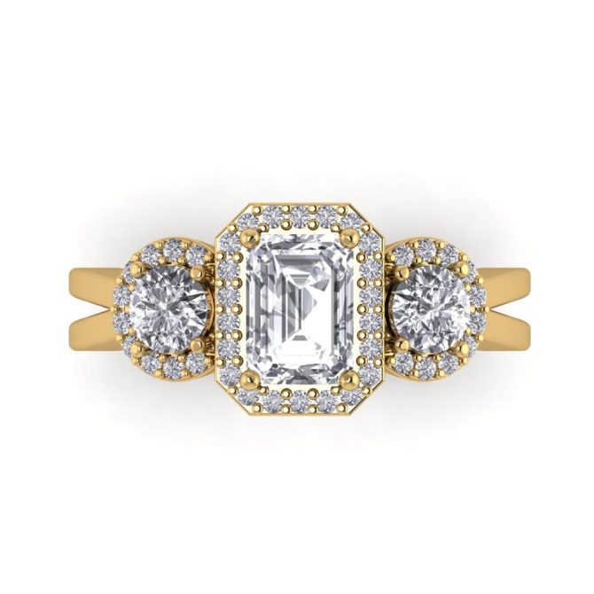 14K Gold Three Stone Collection Stunning White Diamond Ring Featuring 1.00 Cts Emerald cut Shaped White Diamond Surrounded by 0.75 cts Round Shaped White Diamond
