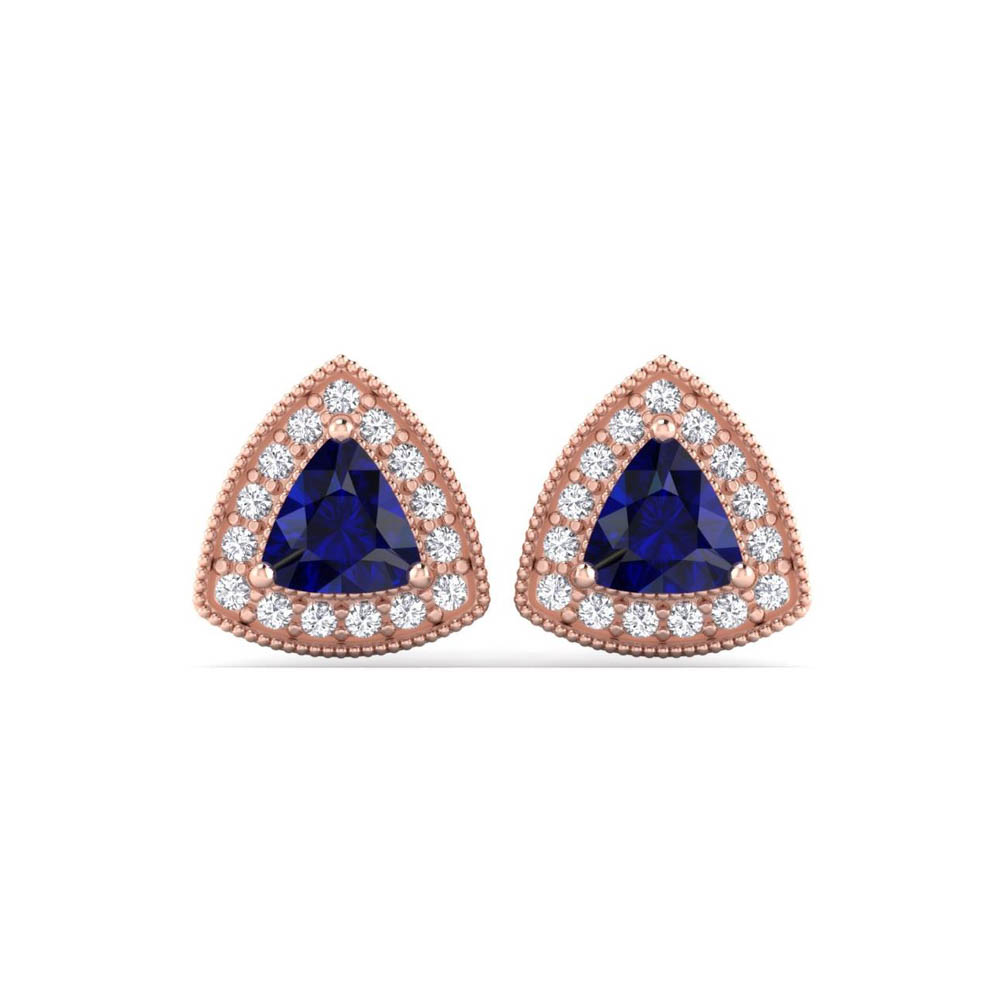 14K Gold Blue Sapphire Earrings Featuring 1.26 Cts Trilliant Shaped Translucent Blue Sapphire surrounded by 0.18 Cts Round Cut White Diamond