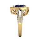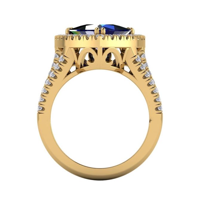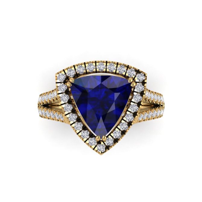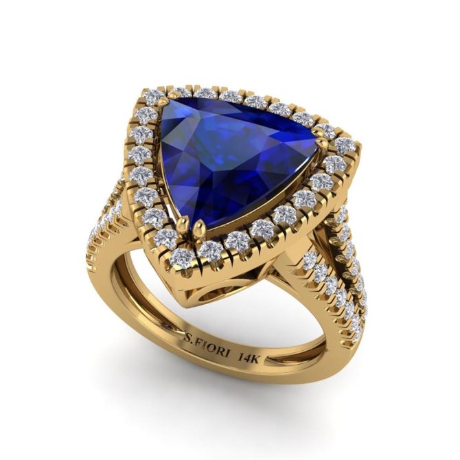 14K Gold Translucent Blue Sapphire Ring Featuring 3.79 Cts Trilliant Shaped Blue Sapphire Surrounded by 0.66 cts Round Shaped White Diamond