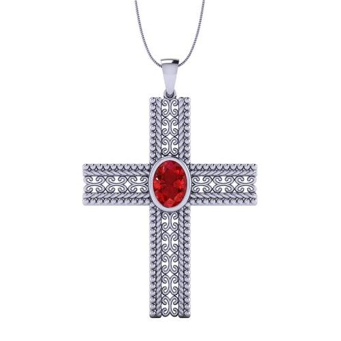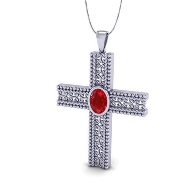 Within the oG Collection, a brilliant cut red ruby (0.65ct) takes center stage in a striking cross pendant. This piece showcases a captivating design, marrying elegance with symbolism.